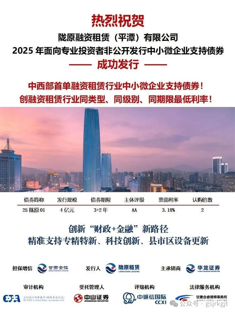 陇原租赁充分依托万象城在线平台(中国)官网“财政+金融”模式优势,以财政政策引导、金融服务协同、投融资联动等方式,吸引资本市场资金全力支持我省实体经济。7月28日,陇原租赁在上交所成功发行中小微企业支持债券,规模4亿元,期限3+2年,票面利率3.18%,认购倍数2倍,是中西部省份首单融资租赁行业中小微企业支持债券,创融资租赁行业同类型、同级别、同期限历史最低利率。